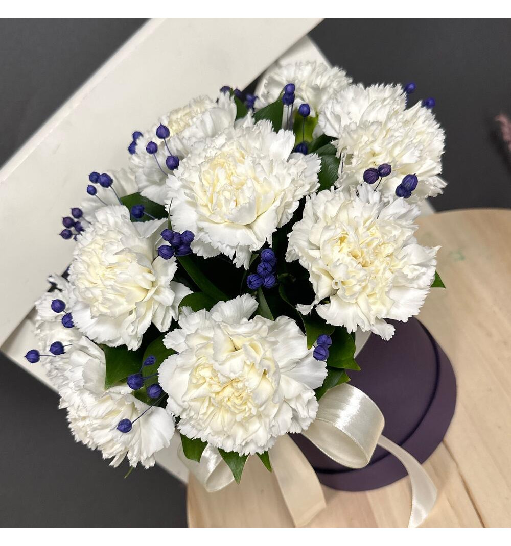 Белоснежные гвоздики в шляпной коробке - это изысканный букет, состоящий из нежных белоснежных гвоздик, которые символизируют чистоту, искренность и вечную любовь. Этот букет является прекрасным подарком для выражения своих чувств и создания особенной атмосферы. Шляпная коробка придает букету уникальный и стильный вид, делая его еще более привлекательным и роскошным. Этот композиция будет прекрасным украшением на любом торжественном мероприятии или просто прекрасным способом порадовать близких и дорогих людей.